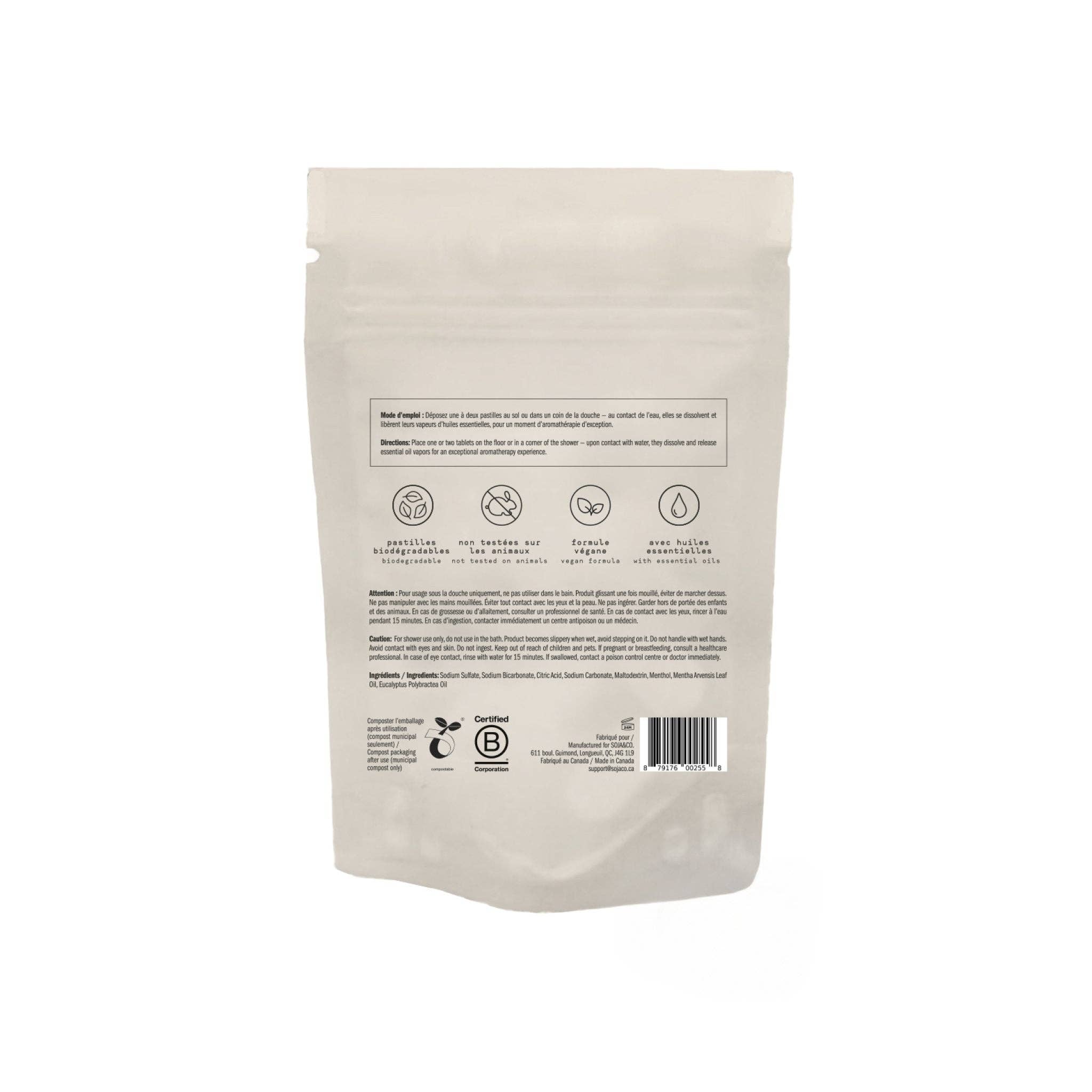 Transform your daily shower into a luxurious spa escape with these eucalyptus-infused steam tablets. Crafted in Quebec with naturally derived, vegan ingredients, each tablet releases a burst of refreshing mint and menthol aromatics when activated by hot water.